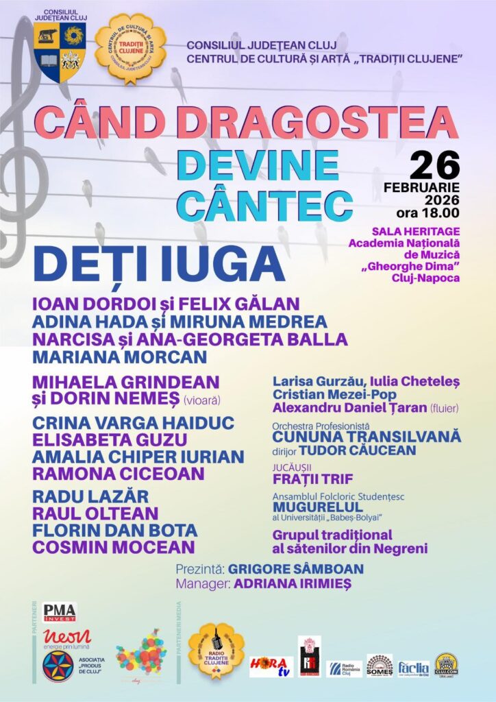 Cluj-Napoca va fi joi, 26 februarie 2026, gazda unui spectacol de excepție, care va aduce pe aceeași scenă tineri talentați și artiști consacrați ai muzicii populare românești. Intitulat „Când dragostea devine cântec”, evenimentul propune publicului o seară dedicată cântecelor de dragoste și dor, interpretate de tineri cântăreți clujeni, alături de nume îndrăgite ale folclorului românesc.
